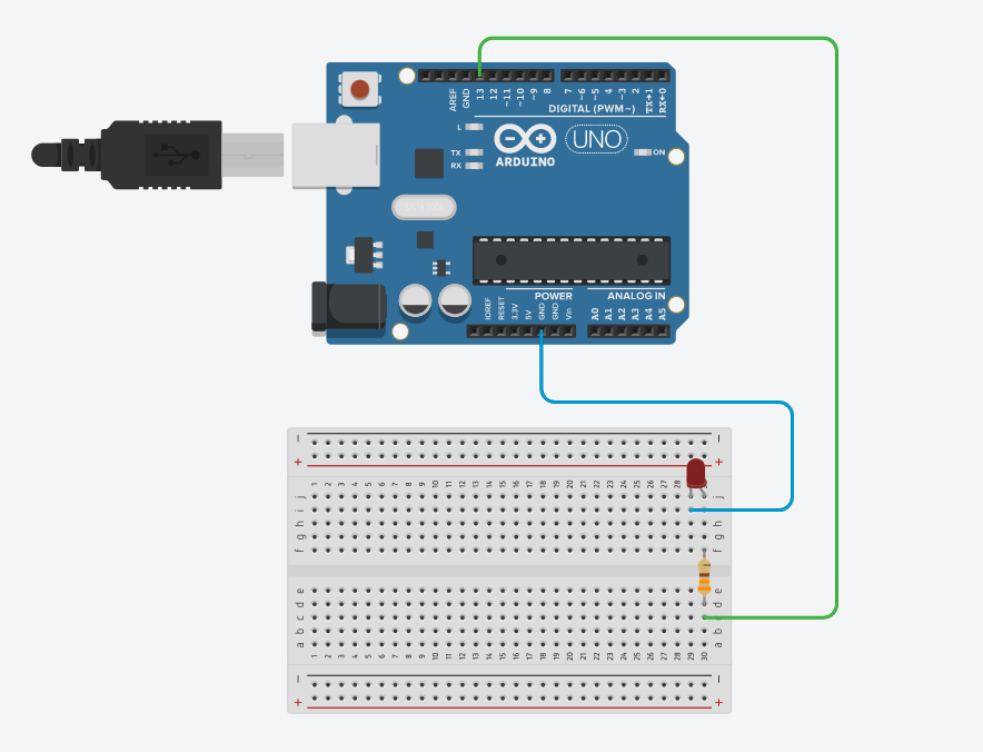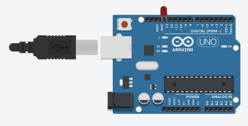 ※ 그림처럼 결선을 하게 된다면 프로그램에 의해 , 13번 핀에서 5V가 출력이 되어서 330옴의 저항을 거쳐 약 2V의