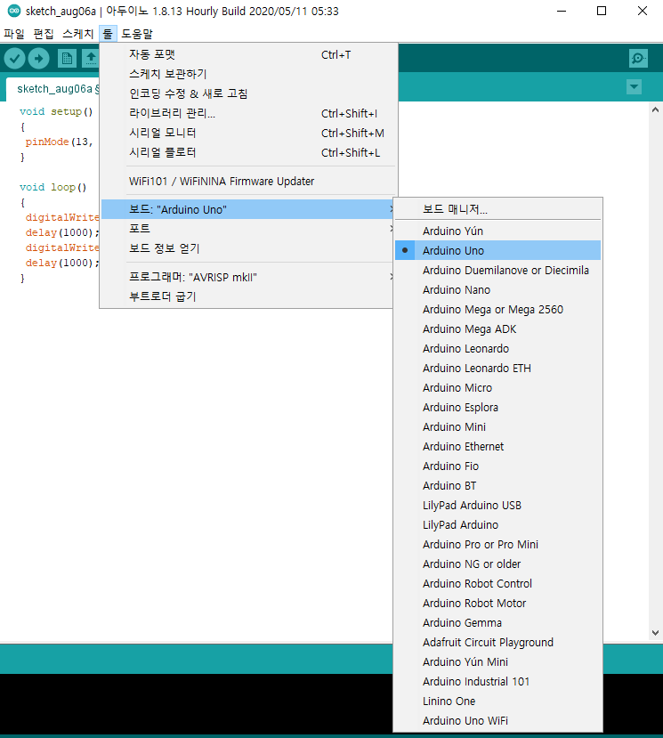 1) 아두이노의 보드 설정 : 툴 -> 보드 -> Arduino Uno