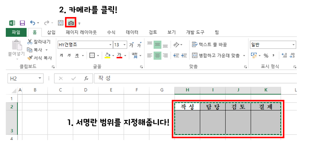 안녕하세요! 오늘은 엑셀 서명란 만드는 방법에 대해서 알아보도록 하겠습니다! 방식은 카메라 기능을 사용해서 만들어 보도록 하겠습니다!